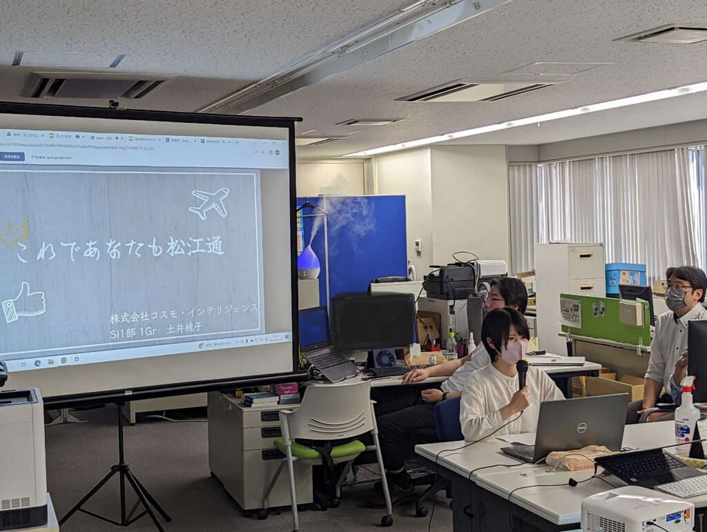 こんにちは。SI1部の清水です。 6月の帰社日の全体会議に、2022年度新入社員の3名による、 プレゼン発表会がありました。 ・Dさん テーマ【これであなたも松江通】 島根県の松江市について発表していただきました。 島根県といえば出雲大社というイメージだったのですが、 宍道湖、松江城といった観光地や、水郷祭という花火大会など、 こんなにも魅力的なものが多かったんですね...。